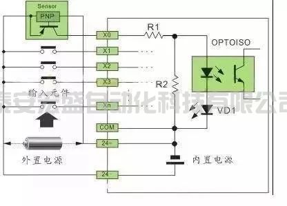 SOURCE源型為電流從輸入端流進(jìn),那么輸入端與電源正極相連即可,說(shuō)明接口內(nèi)部的光電耦合器為單端共點(diǎn)為電源負(fù)極,可接PNP型傳感器。