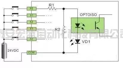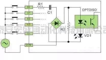 直流電可以由PLC內(nèi)部提供也可以外接直流電源提供給外部輸入信號(hào)的元件。R2在電路中的作用是旁路光電耦合器內(nèi)部LED的電流,保證光電耦合器LED不被兩線(xiàn)制接近開(kāi)關(guān)的靜態(tài)泄漏電流導(dǎo)通。