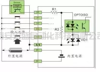 S/S端子與COM端不同的是,COM是與內(nèi)部電源正極或負(fù)極固定相連,S/S端子是非固定相連的,根據(jù)需要才與內(nèi)部電源或外部電源的正極或者負(fù)極相連。